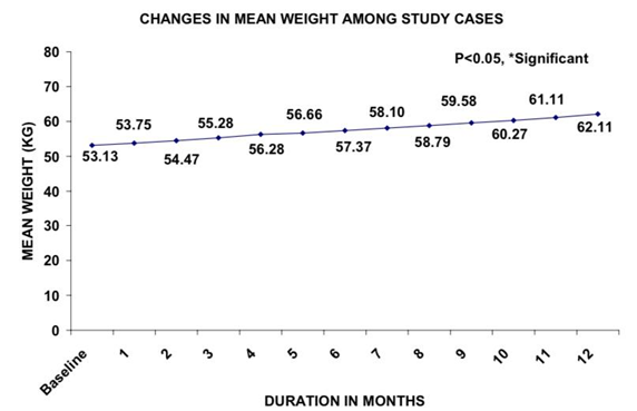 The below Figure 2 indicates that mean weight significantly increased after treatment of Receptol liquid spray from 1 month onwards till end of treatment from baseline.