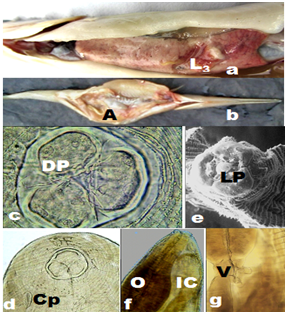 The LSID for this publication is lsid: zoobank.org: act: 7E42164F-A236-4EC1-92CB-74FAE30721F2. The investigations comprised parasitological examination of 2081 Xenentodon cancila, during 2008-2012, out of which 34 of 497 during 2008-2009, 91 of 566 during 2009-2010, 272 of 588 during 2010-2011, and 80 of 430 fish during 2011-2012 were found to be infected. The fresh bottom dwelling fish were collected from the fishermen at River Ganges, Yamuna and Allahabad in Uttar Pradesh, India. The second stage larvae, early third stage larvae, advanced third stage larvae heretofore called as AdvL3 Figure 1a and mature worms (Figure1b &4i) were frequently encountered in a cavity within the liver tissue of infected fish under natural conditions. The mature worms or larvae never occurred in GI tract nor they formed nodules in its wall, but instead favoured hepatic dwellings although the eggs and various other developmental stages, including second stage larvae were recovered by pepsin digestion method20 treatment of muscles and tissues of the fish.