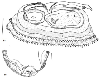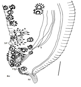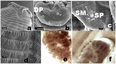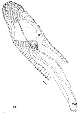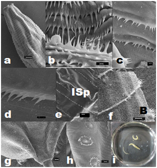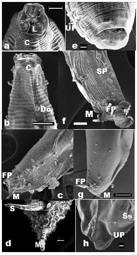 The roundworms were sturdy, cylindrical and light yellowish-brown in colour with typical anisakid ventriculus at the oesophageo-intestinal junction (Figure 1g). Female worms were distinctly larger and stouter than males. The body of larva grew enormously in size, and measured even longer than that of mature female worms. The body was enclosed in a cuticular envelope with a marked aspinose cephalic region with three lips Figures 1c&2a. The anterior end was distinctly demarcated by an elevated post-labial double-ridged collarette Figures 1c,2a&2b at the base of the head, from rest of the body, beyond which the spiny annulations occupied the whole body. The inner margin of the three shallow lips comprised two inwardly projected arms, each with a knob-like terminal end, that were equidistant from the triangular margins of the sclerotized lid-plate atop sclerotized stoma orally Figure 1e. The pedunculate base of each of the three lips was curved inwardly to merge on the side walls of the vestibule, while the pair of inwardly projected arms, with their distal end hanging free, emerged from each of the three lips at the level of curvature of pedunculate base. The three-cornered dorso-lateral anchorage of the lid-plate comprised a marginally ridged structure that encompassed a shallow groove in which individual terminal end of the lid-plate fit tight. This lid-plate with smoother external surface appeared as an adaptive device, and was designed as a filter during feeding, to suit site-specific location of nematodes in softer liver tissues. It had an apparent upward-downward slide, while the edges remained loosely affixed in the grooved corners of anchorage zone. This ensured that there was minimal erosion while sucking liquid from the available space at the margins of the vestibule, beneath the lid-plate in the cavity specially carved by the parasite on the surface of hepatic tissue. This enhanced the functional significance of the structurally modified elements in the oral morphology of roundworms. Of the three lips in mature male, female as well as AdvL3, one dorsal lip comprised two double papillae occupying lateral positions, closer to the margins of the twin-lobed projections oriented towards vestibule with a single amphid. Each of the two ventrolaterals (Figure 2a&3b) comprised one double papilla, one single papilla and a lateral amphid. A pair of deirids (Figure 4a) were present between 25th and 28th row of spines, and two unpaired dome-shaped papilla between 15th and 18th row of spines, and at 20th row of spines each. Nerve ring was located between 7th and 9th rows of spines in the fore body. Excretory pore opens latero-ventrally, located between 21st and 23rd rows of cuticular spines. Cervical sacs two pairs extended upto 24-42nd rows of spines. Oesophagus was divided into two parts Figure 1f-an anterior muscular and a posterior glandular. The hinder extremity of the oesophagus Figure 1g was followed by a prominent bulbar ventriculus, from which emerged ventricular appendix Figure 5b that was split into an elongated, bitubular structure, and an anteriorly directed intestinal caecum of globular shape usually, and overlapped major part of posterior glandular part of oesophagus. The transverse section of the oesophageal glands of AdvL3 and adult worms revealed presence of one to three nuclei Figures 3e,3f. Tail conical with digitate mucronate at the terminal end was covered with minute rows of spines till the posterior extremity. Caudal alae were prominent Figures 2h. Various measurements of different body organs of mature worms of the proposed new genus are summarized in Table 1.