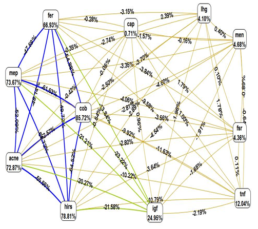 For SNP-SNP interaction analysis, we considered five genes (TNFα, IGF2, CAPN-10, FSHR and LHCGR), for gene-clinical: six factors (acne, hirsutism, central obesity, fertility, menarche age, menstrual period), for SNP-Biochemical: nine factors (fasting glucose, fasting Insulin, HOMA score, LH, FSH, LH/FSH, HDL, Triglycerides, TNF serum levels), for SNP-Hormonal: four factors (free testosterone, total testosterone, androstenedione, DHEA) were considered.