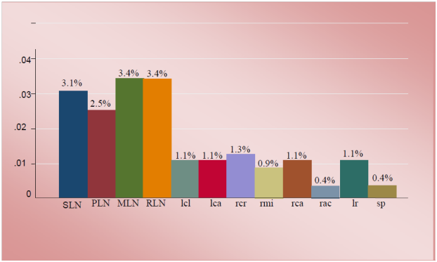 Figure 2 The mean prevalence of tuberculous like lesions in lymph nodes, lungs, liver and spleen. **SLN, submandibular lymph node; PLN, parotid lymph node; MLN, mesentric lymph node; RLN, retropharyngeal lymph node; LCR, left cranial; LCA, left caudal; RCR, right cranial; RML, right middle; RCA, right caudal; RAC, right accessory lobes of lungs; LR, liver; SP, spleen