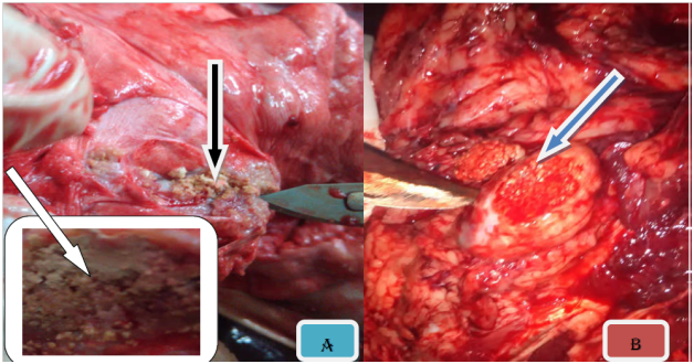 On the basis of gross pathology, in 556 slaughtered swine showed that 19.6% (109/556) were found to have tuberculous like lesions in parenchymatous organs of which 12% (69/556) were from lymph nodes, 5.7% (32/556) of the lungs, 1% (6/556) of the liver and 0.36% (2/556) of the spleen (Figure 2). The tuberculous like lesions found in lymph nodes, particularly those of mesenteric and retropharyngeal, were statistically significant (P < 0.05) than in lungs and associated lymph node. The majority of the lesions were considered to be of typical tuberculous lesions characterized by central round, oval, or irregular, often coalescing areas of caseous necrosis and calcification. The calcified lesions were exceedingly distributed in different lymph nodes and parts of the lungs (Figure 3).