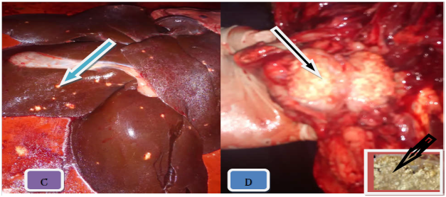 Figure 3 Gross TB like lesion in different organs. Note: The typical caseuos calcified on left caudal lung (A), caseous exudates lesions in retropharyngeal lymph node (B), multifocal hepatic nodules (C), and typical caseous exudates in submandibular lymph node; after parafinized (black arrow) (D).