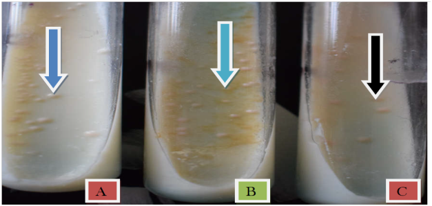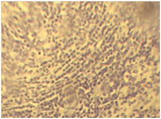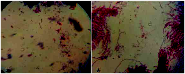 Mycobacterial culturing was conducted from characteristic tubercle lesions of which 7.5% (3/40) showed growth on primary culture media. Of those cultures which showed visible colony, 5% (2/40) were seen on Lowenstain-Jenson (L-J) media enriched with glycerol and the rest 2.5% (1/40) were grown on L-J media enriched with pyruvate. Three grown cultures were subjected to Zeihl-Neelsen staining technique in order to check the presence of acid fast bacilli. 5% (2/40) of the cultures were found to be acid fast positive. The observed colonial morphology was smooth whitish or yellowish color, sticky, off-white and breaks apart easily (Figure 7). The results attained of Z-N staining were cocci, short and some long rod shaped and also found in single and clumps (Figure 8), (Table 6).