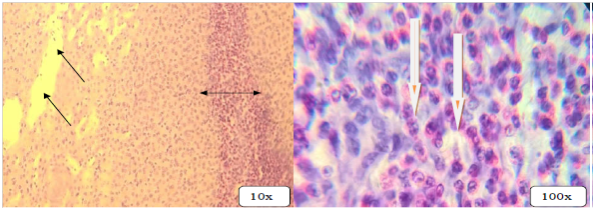 Figure 4 A) Characteristic epitheloid macrophages in the lymph nodes. Note; The epitheloid macrophages shown as elongated (Blue arrow) and the lymphocytes in the next layers (black arrows). H & E stains (10x). B) The characteristic granulomas in the lymph node with calcium deposits (red arrow) at the center, followed by sever necrosis and cellular debris (black arrow) immediate to calcium deposits. H & E stain (10x).