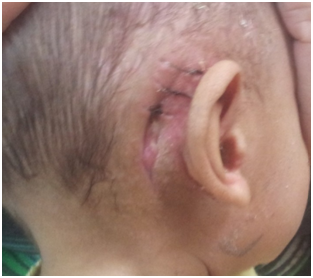 As the patient did not respond to iv antibiotics, he was referred to our hospital. On examination, child was febrile but taking feeds regularly. Local examination of the right ear showed an infected post aural wound with sutures in situ (Figure 1).