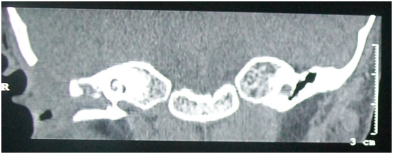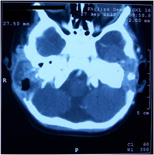 Urine routine examination was within normal limits. C reactive protein was 4.8 mg/dl (positive >0.6). A contrast enhanced computerized tomography (CT) scan of the temporal bone showed bilateral ottitis media with erosion of right side mastoid bone and right post auriclar abscess (Figures 2&3).
