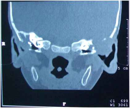 Figure 5 HRCT Temporal bone (coronal view) shows soft tissue density in right middle ear, attic and external auditory canal.