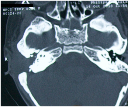 Figure 4 HRCT temporal bone (axial view) shows soft tissue density in right middle ear, mastoid air cells. Left middle ear is normal.