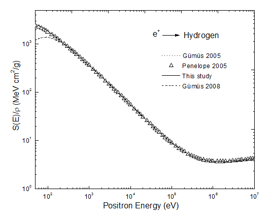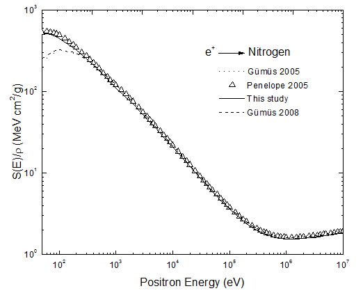 Figure 3 shows the mSP for incident positrons from 50 eV to 10 MeV energy range in nitrogen. The results obtained from this study are compared with the PENELOPE program.26 and results for positrons by using Gümüş calculation methods.12,28 The calculated PSPs values obtained by using Eqs. (21, 22) are good agreement with PENELOPE program 26 results to within 3%.
