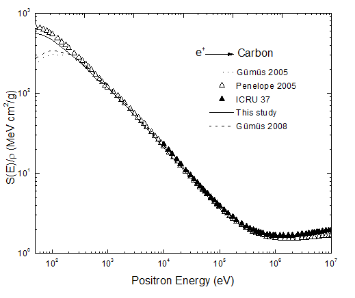 Figure 2 shows the mSP for incident positrons from 50 eV to 10 MeV energy range in carbon. The results obtained from this study are compared with the PENELOPE program,26 values of ICRU 37 report and results for positrons by using Gumus calculation methods.12,28 The calculated PSPs values obtained by using Eqs. (21, 22) are good agreement with PENELOPE program26 results to within 1%. expect at energies below 300 eV.