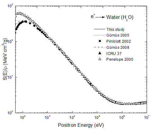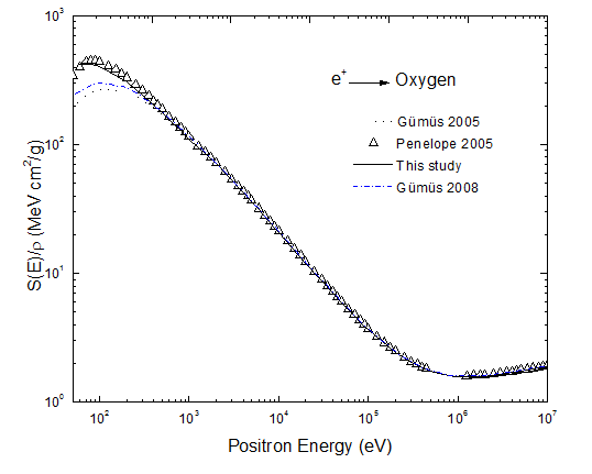 Figure 4 shows the mSP for incident positrons from 50 eV to 10 MeV energy range in oxygen. The results obtained from this study are compared with the PENELOPE program and results for positrons by using Gumus calculation methods.12,28 The calculated PSPs values obtained by using Eqs. (17,18) are good agreement with PENELOPE program 26 results to within 3%.