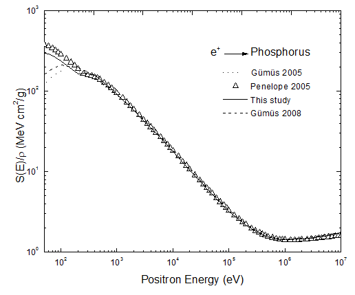 Figure 5 shows the mSP for incident positrons from 50 eV to 10 MeV energy range in phosphorus. The results obtained from this study are compared with the PENELOPE program 26 and results for positrons by using Gümüş calculation methods.8,29 The calculated PSPs values obtained by using Eqs. (17, 18) are good agreement with PENELOPE program22 results to within 2%. expect at energies below 300 eV.