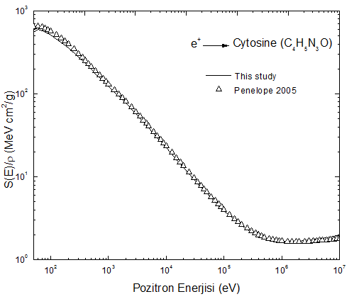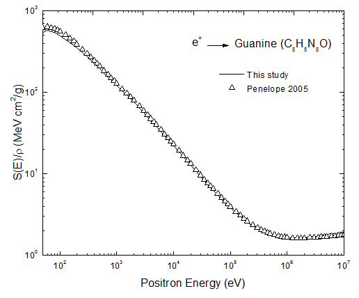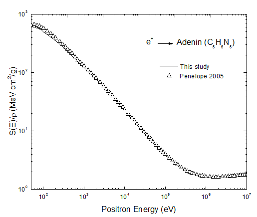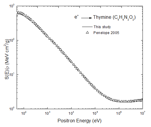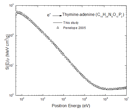 Figure 11 shows the mSP for incident positrons from 50 eV to 10 MeV energy range in thymine-adenine. The results obtained from this study are compared with the PENELOPE program .26 The calculated PSPs values obtained by using Eqs. (17,18) are good agreement with PENELOPE program results to within 5%.