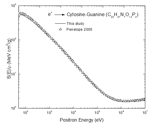 Figure 10 shows the mSP for incident positrons from 50 eV to 10 MeV energy range in cytosine-guanine. The results obtained from this study are compared with the PENELOPE program.26 The calculated PSPs values obtained by using Eqs. (17,18) are good agreement with PENELOPE program results to within 5%.