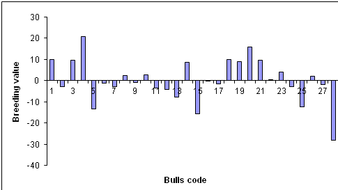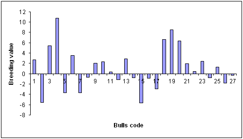 The highest breeding value of weaning weight is the bull coded 73996 with a relative breeding value of 12.164, it means that if the bull 73996 mated to the cows randomly then the mean weaning weight of offspring will be 6.08 higher than the mean weaning weight of population, because bulls superiority will be transferred by a half of breeding value.20