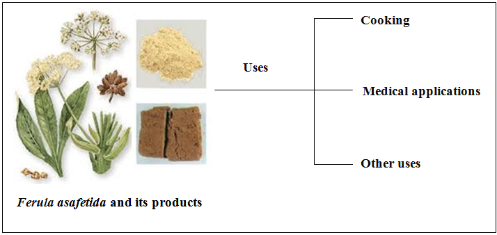 In recent years, there has been much importance placed on finding novel therapeutic agents from F. asafoetidaplant and it’s common name is Asafoetida. It is commonly used as a traditional medicine in Iran, Afghanistan and India. It is herbaceous plant of the Umbelliferae family and its root contains oleo gum resin which has many medicinal properties. The resin is solid or semisolid with alliaceous odor and a bitter acrid taste, which comprises ferulic acid, umbelliferone, asaresinotannols, umbelliferone ethers, gums and volatile oils. The sulfides of volatile oils are responsible for the characteristic flavor of Asafoetida1 Asafoetida is commonly used for cooking purpose as it is an indigenous medicine which cures sporadic disorder and stimulates digestion. Figure 1 shows the schematic representation of plant Ferula asafetida and its various applications.The free radicals are the main cause for oxidative damage to biomolecule such as DNA, proteins and lipids, which leads to many chronic diseases such as atherosclerosis, diabetes, aging, degenerative diseases and mainly cancer.2-5 Formation of free radicals such as superoxide anion (O2-) radical and hydroxyl (OH) radical is an unavoidable consequence in aerobic organisms during respiration. Uncontrolled generated free radicals are very unstable, and react rapidly with the other groups or substances in the body, leading to cell or tissue injury. Numerous physiological and biochemical processes in the human body may produce oxygen-centered free radicals and other reactive oxygen species as byproducts.