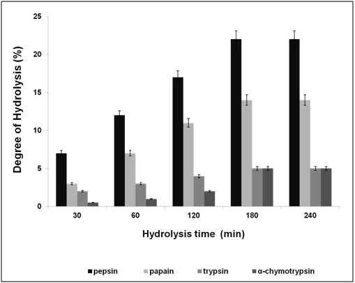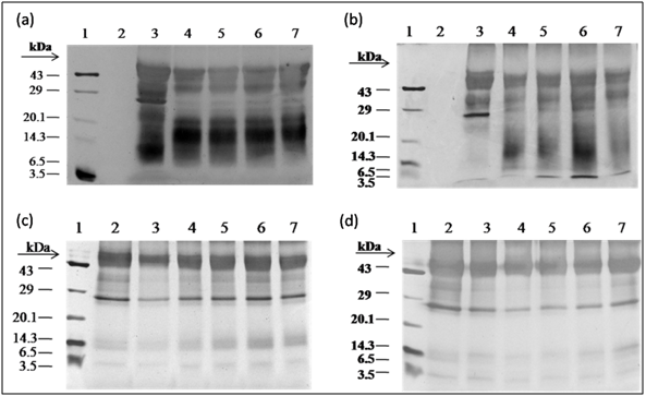 F. asafoetida root exudates protein was hydrolyzed enzymatically using simulated gastrointestinal fluid with enzymes (Papain, pepsin, trypsin, and α-chymotrypsin) which were optimized as shown in Table 1. The enzyme: substrate ratio (w/w) was 1:50 incubated at different time periods (30, 60, 90, 120 and 180 s) and then heated for 2 min at 100°C. The digested protein was separated in resolving 14% Laemmli, Glycine SDS-PAGE, followed by silver staining. Degree of hydrolysis was determined by measuring the nitrogen content soluble in 10% trichloroacetic acid as described previously [6].