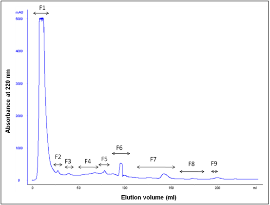 F. asafoetida root exudates hydrolyzed protein was loaded onto a Gel filtration column (Superdex 30 prep grade) connected to a fast protein liquid chromatography (FPLC). ÄKTApurifier™ chromatography system (ÄKTA purifier Frac-950 at a flow rate of 2 mL min-1) from GE Healthcare was used for fast and reliable separation of proteins. The column was equilibrated and eluted with 20 mM phosphate buffer (pH 7.2). The separation profile was monitored at wavelengths 280 and 220 nm using a UV detector. Each hydrolyzed protein was collected, lyophilized and stored at -20°C. These fractions were tested for antioxidant activity.