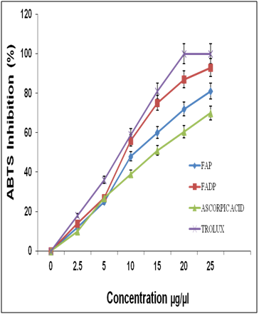 ABTS radical-scavenging activity assay: The free radical scavenging capacity of hydrolyzed protein fractions was studied using the ABTS radical cation (ABTS+) decolorization assay, which is based on the reduction of ABTS+ radicals by antioxidants property of hydrolyzed protein. This assay was carried out in 96 well ELISA plates. ABTS 7 mM concentration was dissolved in deionized water. ABTS+ was produced by reacting ABTS solution with 2.45 mM potassium persulfate (final concentration) and allowing the mixture to stand in the dark condition at room temperature for 12-16 h, before use. In the experiments, the ABTS+ solution was diluted in deionized water or ethanol to 0.7 Å at 734 nm using Multiskan GO (Thermo Scientific, USA). An appropriate solvent blank reading was taken. The different concetration (2.5 µg to 30 µg) of hydrolyzed protein solution 20 µL was added to 190 µL of ABTS+ solution, follwed by incubation for 37°C at 30 min. The absorbance reading was taken at 734 nm and plotted against the linear standard curve between 20- 800 µM of Trolux soluion.17 All solutions were freshly prepared before expreiments and performed in triplicate. The percentage of inhibition of ABTS+ was calculated using the formula
