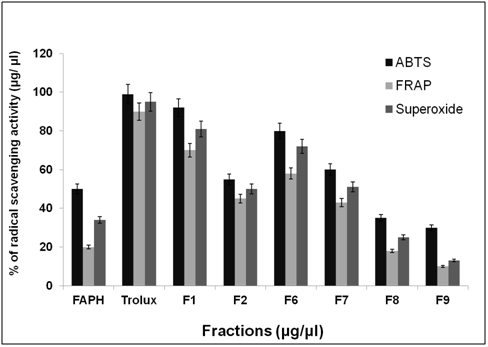 After purification by FPLC, nine fractions were collected and tested for antioxidant activity as shown in Figure 6. ABTS, FRAP and superoxide radical scavenging activity was used to estimate the antioxidant mechanism, due to the rapid reaction process (i.e. within 5 to 10 mins). The antioxidant activities of hydrolyzed factions were tested using ABTS, FRAP, Superoxide assay. The ABTS+ radical scavenging activity of pepsin digested F. asafoetida root exudates protein was tested. The relative antioxidant ability to scavenge the radical ABTS+ has been compared to the standards trolox and ascorbic acid, which is an excellent tool for determining the antioxidant activity. The result showed that there was an increase in the ABTS radical scavenging capacity of F. asafoetida root protein exudates up to a concentration of 25 µg/µl followed by comparatively low increase, with further increases in concentration. The result clearly depicted that ABTS+ assay for Fraction (F1, F2, F6) had maximum activity of 92, 75, 81% and F7, F8, F9 was < 60 % of activity. The other assay, FRAP showed F1, F2, F6 fraction had a maximum activity of 73, 60, 58 % and F7, F8, F9 had activity of < 40%. Finally, the reproducibility assay of superoxide scavenging activity showed that F1, F2, F3 had maximum activity of 81, 65, 72 % and F7, F8, F9 had activity of < 50%. From the result, Fraction 1 showed higher antioxidant properties and exhibited considerable scavenging potencies on ABTS+, FRAP, superoxide assays. Among three assays carried out in this study, ABTS showed comparatively enhanced activity than that of others. Another advantage of the ABTS was that extracts reacted rapidly with ABTS. Among the fractions, fraction 1 showed the highest peak and higher antioxidant activity compared to other fractions in three different antioxidant assays. As the response of antioxidants depends on many factors, the antioxidant activity of the hydrolysates was characterized using different assays based on different antioxidant mechanisms. The ABTS radical cation scavenging assay is applicable to both lipophilic and hydrophilic compounds and has been widely used to assess antioxidant activity.24 ABTS assay is an excellent tool for determining the antioxidant activity of hydrogen-donating antioxidants (scavengers of aqueous phase radicals) and of chain breaking antioxidants (scavenger of lipid peroxyl radicals).25