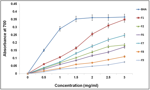 The reducing power assay of hydrolyzed protein was investigated following the method reported by Zhu et al.22 and the results are shown in Figure 7. To measure the reductive ability of protein hydrolysates, different fraction were studied for the reduction of Fe3+ to Fe2+. The reducing power of fraction (1) was excellent, which increased steadily with increase in the concentration of samples. At 3 mg, the power of reducing was higher than 0.38. Thus, this data supports the antioxidant activity of fractions.