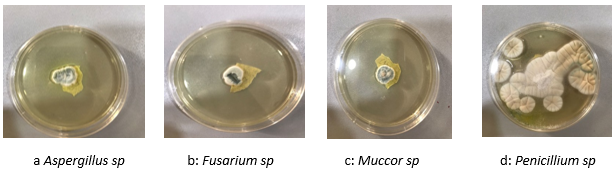 The four (4) fungal isolates that were isolated from heavily fungi infested tomato collected within Akwa Ibom state were examined for morphological variations. A 7 day old pure fungus cultures grown at 25 ± 20C on PDA growth medium were macroscopically and microscopically examined, photographed and documented as seen in Figure 1: a,b,c and d. Morphologically, most of the fungi showed characters like colony color, size, shape as observed visually and microscopic characters manifested to include distinct variations with respect to the conidiophores, length, wall, vesicle size, and shape