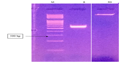 Electrophoresis was viewed on the UV trans-illuminator which showed about 500bp PCR products.