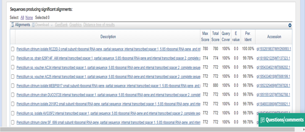 For microscopic examination of each fungal isolate, small pieces of fungal colony were smeared on a slide and focus on 40 magnification lense of a calibrated compound microscope. Complete description of each isolate based on macro and micro morphological characters observed was arranged. Fungal isolates were splited out by its descriptive comparison according to Thom18 Their common genotypic and phenotypic characters were confirmed molecularly by using Internal Transcribed Spacer ITS sequence analysis of ribosomal DNA rDNA