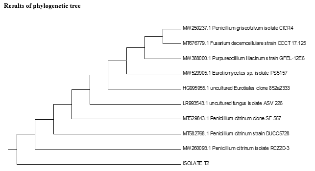 However, after morphological identification of the fungi isolates using a microscope, each specie like Penicillum citrinum (Figure 1) was taken for molecular profiling or characterization. Molecular profiling provide valuable information on genetic diversity putative organisms in view of its ability to decipher variation among organisms existing at the rDNA level. Profiling of any organisms up to species level is of fundamental importance for rapid identification and diversity studies.28 This showed that for the profiling of the fungal diversity, it is essential that individual fungus be classified accurately to species level. Furthermore, to establish effective management of tomato fruit against diversities of fungi attack, it is imperative to go as far as molecular profiling, with which genetic variations could be detected. The genetic compositions of organism are always distinct. In view of this, their discrimination from among numerous types and their wild relatives becomes necessary.