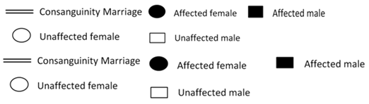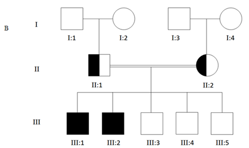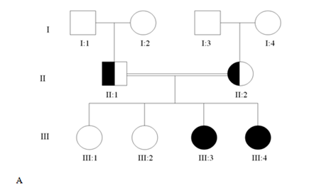 Figure 3.1 Pedigree of Saudi Arabian families segregating CTLN1 in an autosomal recessive fashion. A represent the first family, B represent the second family, circle represents female individuals, while square represents male individuals. Filled symbols represent affected members.