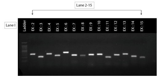 Figure 3.2 1% Agarose gel electrophoresis pattern of PCR amplified coding exons of the ASS1 gene for the first family, patient (III:3). Lane I (ladder size= 10bp) , lane 2-15 (exons 2-15), the size of exon 7 (300bp).