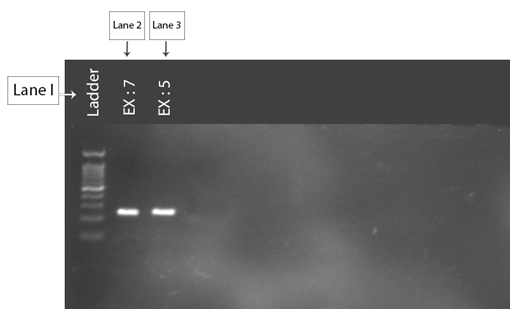 Figure 3.4 1% Agarose gel electrophoresis pattern of PCR amplified coding exons of the ASS1 gene for unaffected individuals, Lane I (ladder size=10bp) lane 2 (exon 7) for the first family (II:2) lane 3 (exons 5) for the second family (II:2), the size of exon 5 and 7 (250bp).