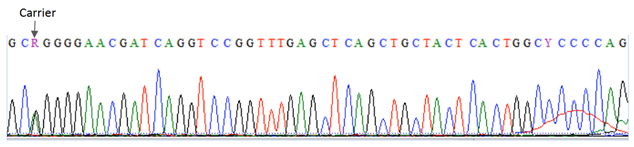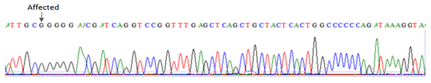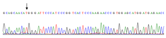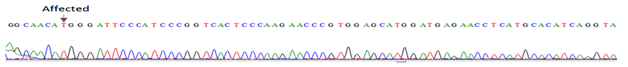 Figure 3.6 Electrochromatograms of one coding exon of ASS1 gene sequenced in citrullinemia patient (II:2). Arrow head indicate point of variant.