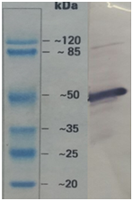 The recombinant pEGFP-N1-TNFR vector was confirmed with the specific primers. The his-tagged TNFR was expressed and purified via affinity chromatography. It was analyzed using SDS-PAGE. The TNFR protein band with 53kDa in size is observed in Figure 2 and illustrates the results of the Western blot analysis of the purified protein. Transfection of the recombinant pEGFP-N1 / TNFR vector in the CHO cells was performed using a calcium chloride buffer method. After 40hours, green fluorescent light in the desired positive cell line control sample containing pEGFP-N1 and transfected cell line with recombinant plasmid was observed Figure 3.