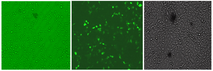 Transfection of the recombinant vector in the CHO cell line using a calcium chloride buffer. CHO cell line was cultured routinely in the DMEM culture medium containing 10% fetal calf serum (FCS), 100U/ml penicillin, and 100µg /ml streptomycin at 37°C 5% CO2. The cells were separated by Trypsin 24hours before transfection. When the cell density reached 60–70%, transfection was carried out with the pEGFP_TNFR plasmid. Three hours before transfection, the cell culture medium was replaced with serum-free DMEM. Two solutions were prepared in two separate tubes: 1 x HBS (solution 1) and a solution containing 9µg of DNA and calcium chloride (2M) (solution 2). Solution 2 was added to Solution 1 and the resulting solution was incubated at room temperature for 20minutes and added gradually to the cell flask. Following incubation for 16hours, the culture medium was replaced with the neomycin DMEM. Then, 40hours later, TNF receptor gene expression was analyzed by fluorescent microscopy.