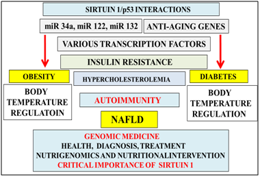 Figure 1 The anti-aging gene Sirt 1 is defective in obesity and diabetes with miRNAs relevant to Sirt 1 repression. Nutrigenomics is now important to genomic medicine with activation of Sirt 1/p53 interactions important to transcriptional dysregulation of cell glucose and cholesterol metabolism. Defective Sirt 1 activity in cells may be associated with insulin resistance and autoimmune disease and connected to programmed cell death in various tissues/organs. Nutritional interventions in individuals with chronic diseases may be ineffective with relevance to thermoregulation defects in individuals in the global chronic disease epidemic.