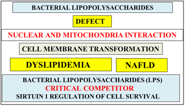 Figure 2 Bacterial lipo polysaccharides may act as a competitive inhibitor to Sirt 1 and prevent its role in the survival of cells in many diseased tissues. LPS may induce cell membrane transformation with the induction of dyslipidemia and NAFLD. The major defect in diseased cells from the global chronic disease epidemic is the defective nuclear-mitochondria interaction with relevance of LPS to increased toxicity and autonomous organ disease.