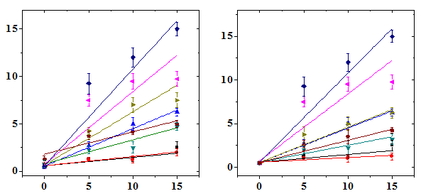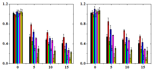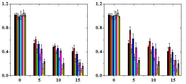 The results are expressed as micronucleated polychromatic erythrocytes (MPCE) or micronucleated normochromatic erythrocytes (MNCE) per 1000 ± SEM (standard error of the mean) and PCE/NCE ratio ± SEM (Table 1-3 & Figures 1-3). Administration of various doses of NIN alone did not alter the spontaneous frequency of micro nucleated polychromatic erythrocytes significantly (Table 1). Treatment of mice with different doses of DOX caused a significant but dose dependent rise in the MPCE frequency at all post-scoring times studied with a highest elevation for 15 mg/kg DOX (Figure 1). The frequency of MPCE increased with increasing scoring time and a maximum increase in MPCE frequency was scored at 48 h post treatment for all DOX doses. Thereafter MPCE registered an abrupt decline at 72 h and it was approximately 1.8 to 2.6 fold lower than that of 24 h depending on the DOX dose (Table 1). Treatment of mice with various doses of DOX also induced MPCE bearing two micronuclei at all post-treatment times and their frequencies were highest at 48 h post-treatment, which declined thereafter (Figure 1). This increase in MPCE was approximately 4 (p<0.001), 10 (p<0.001) and 13 (p<0.001) folds, at 12 h, 8 (p<0.001), 17 (p<0.001), and 19 (p<0.001) folds, at 24 h, 17 (p<0.001), 30 (p<0.001), and 37 (p<0.001), folds, at 48 h and 9 (p<0.001), 17 (p<0.001), and 14 (p<0.001) folds, at 72 h, for 5, 10 and 15 mg/kg DOX, respectively when compared with the non DOX-treated control (Table 1). The pattern of increase in MPCE in NIN+DOX group was identical to that of DOX group except that the treatment of mice with 2.5, 5, 7.5 and 10 mg/kg b. wt. NIN before administration of various doses of DOX caused a significant but NIN dose dependent reduction in the frequency of MPCE depending on the scoring time (Table 1). A greatest reduction in MPCE was observed for 10 mg/kg NIN. The protection factor depended on the dose of NIN and a highest PF of 2 was observed for 10 mg/kg NIN for all doses of DOX at 48 h post-treatment (Table 4). The frequency of PCE bearing two and multiple micronuclei revealed no specific pattern of induction except that at 48 h the MPCE with 2 MN showed a DOX-dose dependent elevation, whereas NIN treatment reduced the frequency of DOX-induced 2 MNMPCE in NIN dose dependent fashion (Table 1). The dose response was linear (Figure 1).