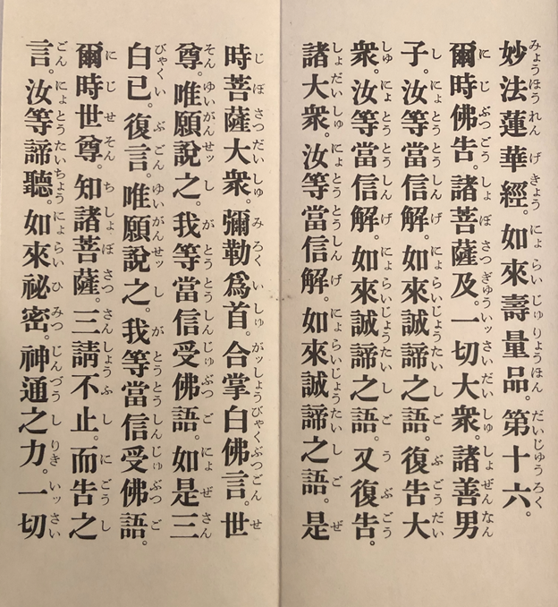 Figure 1 A Nichiren Shoshu sutra book of the 16th Chapter (Juryo - Lifespan) of the Lotus Sutra. Within the Juryo Chapter of the Lotus Sutra, the Buddha hid the essential Law of Myoho-Renge-Kyo, the vital entity that allows all people to become Buddhas. Image scanned from the author's personal collection.