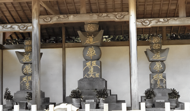 Figure 2 Memorial monument honoring Nichiren Daishonin (center), with the memorials of the Second High Priest Nikko Shonin and the Third High Priest Nichimoku Shonin positioned to the right and left, respectively, relative to the central monument. Photograph taken by the author in the mid-1980s at Taisekiji Head Temple.