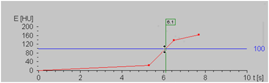 Figure 1 Example of 100 HU in Test being reached Bolus. The time at which the injection (20 mls) reached the threshold of 100 HU is noted at 6.1 seconds. Peak arterial enhancement is not taken but the threshold time of 100 HU