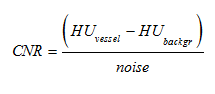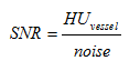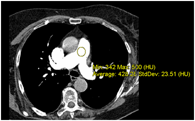 Signal to Noise ratio was calculated in the main pulmonary artery (SNRs; i.e., average attenuation divided by average noise) the same method used by other recent studies (Figure 3).5 Contrast to Noise ratio was defined as HU in main pulmonary artery minus HU in background divided by noise (Figure 4). Contrast media injections were performed with a power injector. All injections took place at a rate of 4ml/sec through an 18 gauge bore cannula sited at the antecubital fossa. No preference was taken for right or left side. Flow rate was kept constant at 4ml/sec throughout the procedure for all examinations. At both 100 and 120kVp, the injected iodine concentration was the same throughout (350).