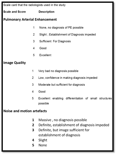 The Kappa statistic is intended to provide a quantitative measure of magnitude of agreement between observers13 in this case two different radiologists rating the same CTPA scans. It allows inter-observer variation to be measured where two or more independent observers are evaluating the same thing. The student t-test is used when one wishes to compare the means of two different groups. The same scoring sheet was employed by both radiologists when assessing images (Figure 5).