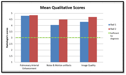 In relation to noise and motion artefacts there was only slight agreement with a P-value indicating that this was not statistically significant. Regarding image quality once again there was only slight agreement between both radiologists with a P-value indicating that this was not statistically significant. A graph illustrating the qualitative scores as assessed by two radiologists which read the same images can be seen in Figure 6. The number of images assessed subjectively by radiologists was quite small with only 10 images out of 50 in both the 100kVp (Group A) and 120kVp (Group B) group being assessed. This study did focus more on quantitative measurements and results rather than qualitative data. A more comprehensive involvement of image quality and non-parametric data with a larger sample size the author feels is one of the limitations of this study. Patients were not catergorised according to weight or age either.