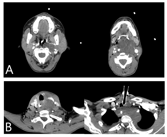 Figure 1 Axial CT findings: A and B Showed a hypoattenuating solid expansive lesion, affecting the left superior parapharyngeal space, carotid space, extends inferiorly to the hypopharynx and retropharyngeal space, obliterating the supraglottis and glottis.