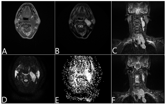 Figure 2 MRI findings: (A) In the T1-weighted sequence it presented low signal. (B) In the T2-weighted sequence presented high signal. (D/E) Diffusion weighted imaging (DWI) and apparent diffusion coefficient (ADC), without evidence of diffusion restriction. (C/F) Coronal T2 STIR showing all involvement of the vagus nerve from the pars vascularis of the jugular foramen extending to the superior mediastinum and returning to the recurrent laryngeal nerve.