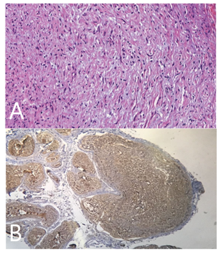 A 28-year-old woman with a history of cervical bulging with 12 months of evolution, complaining of dyspnea which has been increased in the last 4 months, associated with weight loss, dysphagia and neck pain. Initially the patient was evaluated by the head and neck surgery team. They performed a direct laryngoscopy with a biopsy, observing a submucosal lesion that increased the vallecula bilaterally and epiglottis. This lesion blocked the visualization of the supraglottis and vocal cords. Subsequently, the patient had respiratory insufficiency and tracheostomy was required, performed imaging study with computed tomography–CT (Figure 1) and magnetic resonance imaging-MRI (Figure 2) which shows morphological aspects of the lesion. The final diagnosis of a giant vagal schwannoma was determined by the histology and immunohistochemistry analysis (Figure 3). Allowing the correct surgical propedeutic.