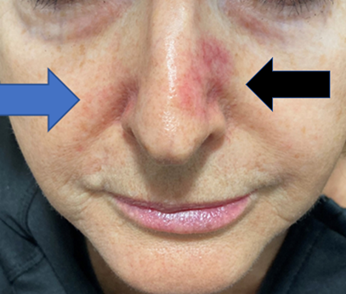 Figure 1 A case study where astute nursing helped explain an unexpected acute reaction. A middle-aged woman having definitive SXRT for a basal cell carcinoma (BCC) on the left upper nasal alar (black arrow) noticed redness on the right alar (blue arrow) at the halfway point of a prescribed course of SXRT. This redness was in the epidermis, a hierarchically organised cell population. Initially the RT staff thought this reaction was due to how the SXRT cut out was taped to the skin and sought the nurse’s opinion. The nurse thought that this could be due to “shine through” from SXRT. The physics team was consulted, and in vivo dosimetry (IVD) was conducted. Doses high enough to cause redness were measured. “Shine through” is when the SXRT beam continues to penetrate through the body and exits through another epithelial surface. In this case, the air in the nasal vestibules meant that less dose was absorbed in the SXRT path, enabling the skin on the contralateral side to be irradiated. The radiation oncologist (RO) was consulted to consider replanning, but this may have required reorientation of the beam which would have compromised the gross tumour volume (GTV) cover and sent dose into other normal tissues. The patient was counselled and agreed to continue the course, which was completed with no further issues. The area affected by the shine through healed spontaneously after RT completion.