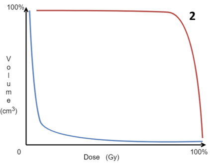 Figure 2 As the volumes of the target and OARs are known, and doses have been computed through the treatment volume, a dose – volume histogram (DVH) can be constructed. Volume is on the vertical Y axis and dose is on the horizontal X axis. The aim of RT is to cover all the volume of the PTV with as much of the prescribed dose as possible, so on the DVH, the PTV line should approximate the red line. The OARs should receive the least dose to the smallest part of the volume, ideally where the blue line is.
